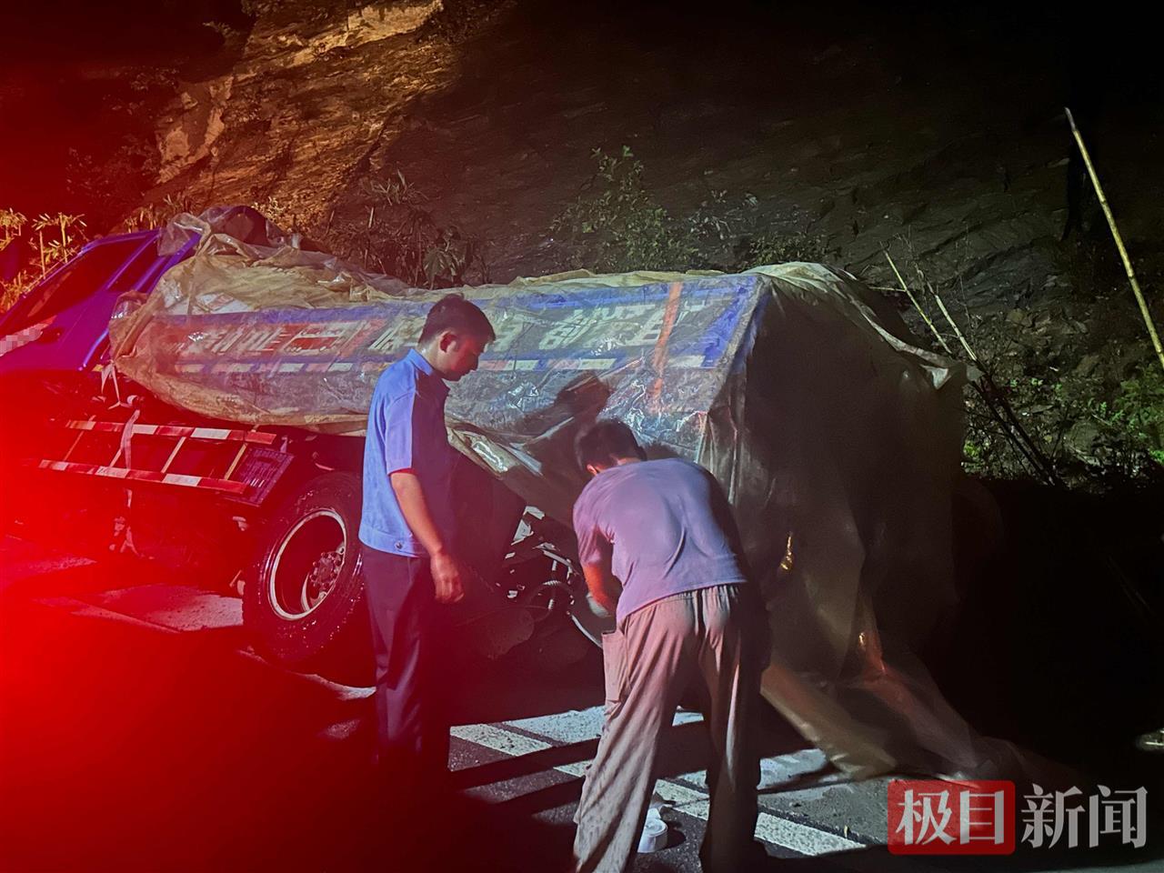 10分钟后,民警驱车赶到事故现场。大货车侧翻在朱砂村小地名王家店公路靠山体一边,右前轮和右后轮掉入50厘米深的边沟里。“你人没事吧?”“我还好,没受伤。只是在下小雨,我担心这一车饲料会被淋坏!”“夜晚视线差,不利施救,先找塑料薄膜把猪饲料盖住,等天亮了我们再想办法调吊车前来施救。”
