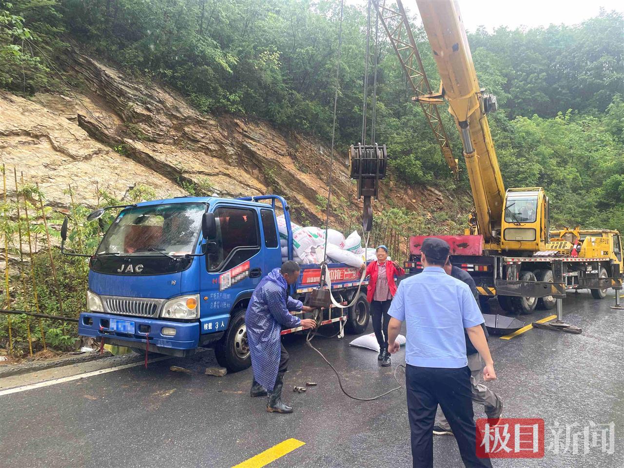吊车将侧翻货车吊起扶正(通讯员供图)