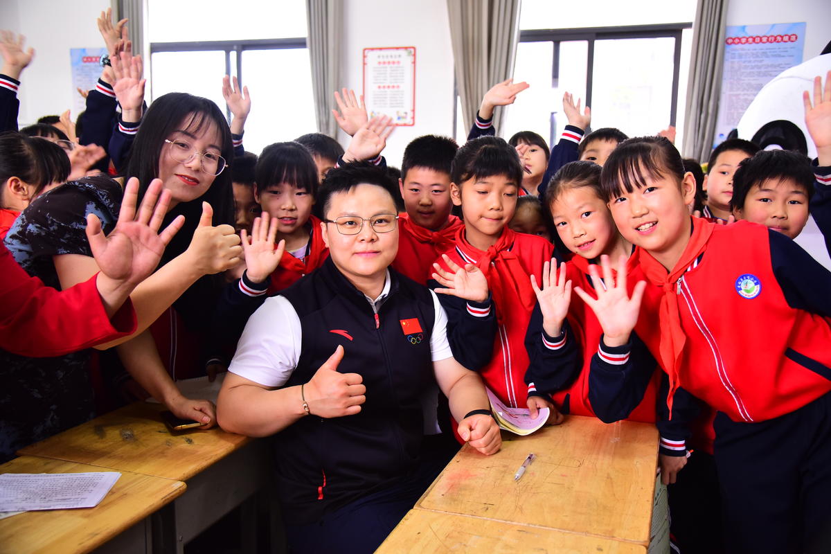 捐赠仪式结束后,汪周雨走进学生中间,与大家进行了亲切互动。汪周雨分享了自己的奥运夺冠经历和成长故事,讲述了在训练和比赛中遇到的困难和挫折,以及如何通过坚持不懈的努力克服困难,最终实现梦想。汪周雨还现场指导学生们进行了简单的体育训练,耐心地纠正学生们的动作,鼓励学生们要积极参与体育锻炼,增强体质。