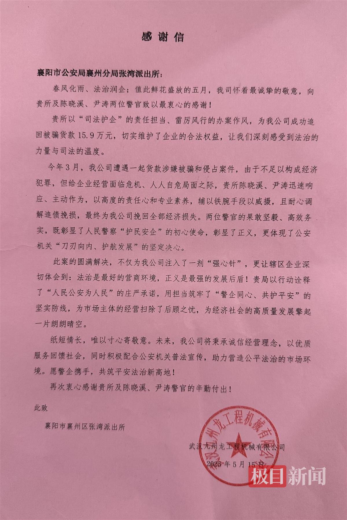 正逢5·15全国经侦宣传日之际,湖北武汉九州龙工程机械有限公司向襄阳市襄州区公安局送来感谢信,对张湾派出所陈晓溪、尹涛及经侦大队民警高效为企业挽回15.9万元经济损失表达诚挚谢意,点赞警方”护航企业发展有担当”。
