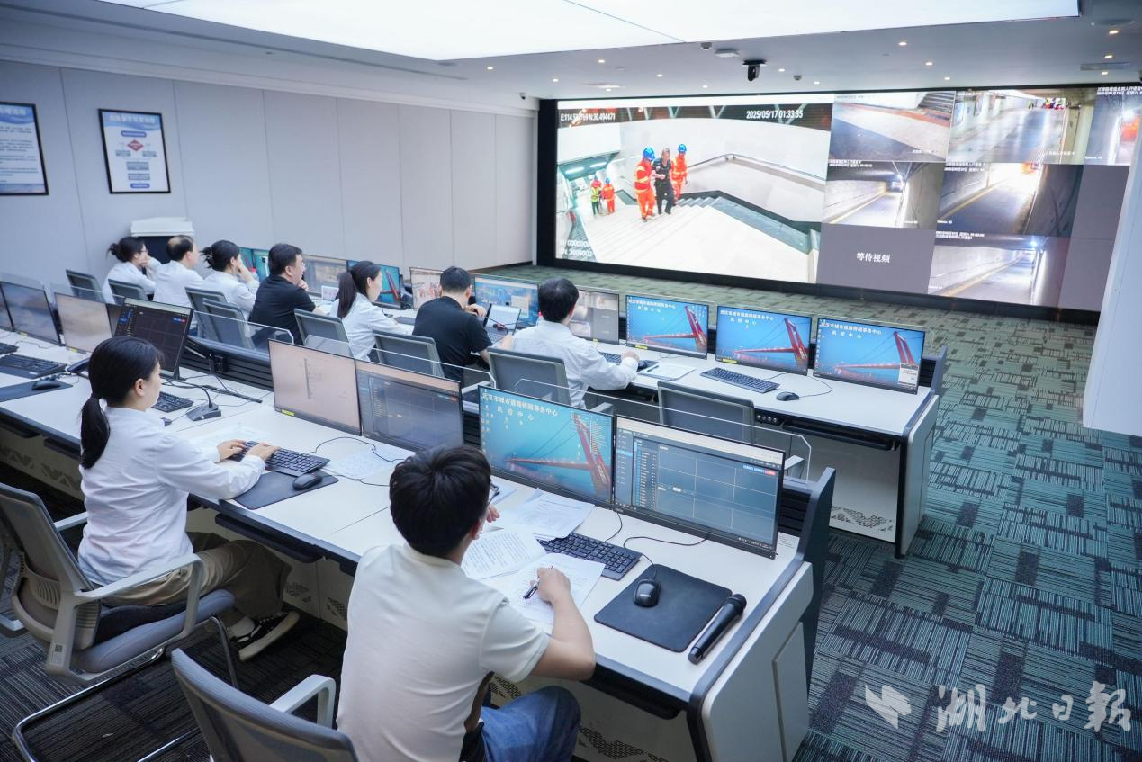 位于武汉城市道路桥隧事务中心风控中心的指挥中枢里,大屏实时播放着各演练点位的实况。演练正式开始,风控中心依据气象预报,通过城市道路桥隧安全监管平台,迅速向各桥隧管养单位下达调令,启动应急处置。应急队伍闻令而动,快速集结,奔赴一线。