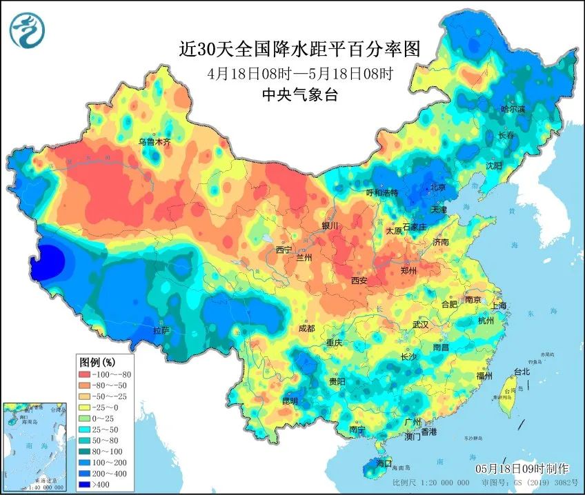 从全国降水距平图可以看到,过去一个月我国西北地区降水较常年严重下降,为沙尘天提供了条件