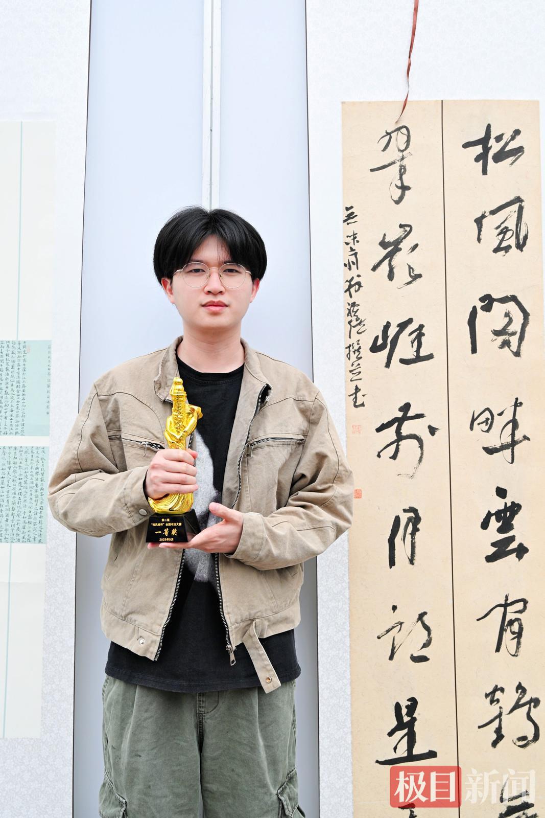 今年22岁的翁骥煜是北京语言大学大四学生,他凭借一副对联获得一等奖。他感言,这场汇聚全国书法精英的专业赛事,自己的作品能在强手如林的角逐中脱颖而出,感到十分荣幸。