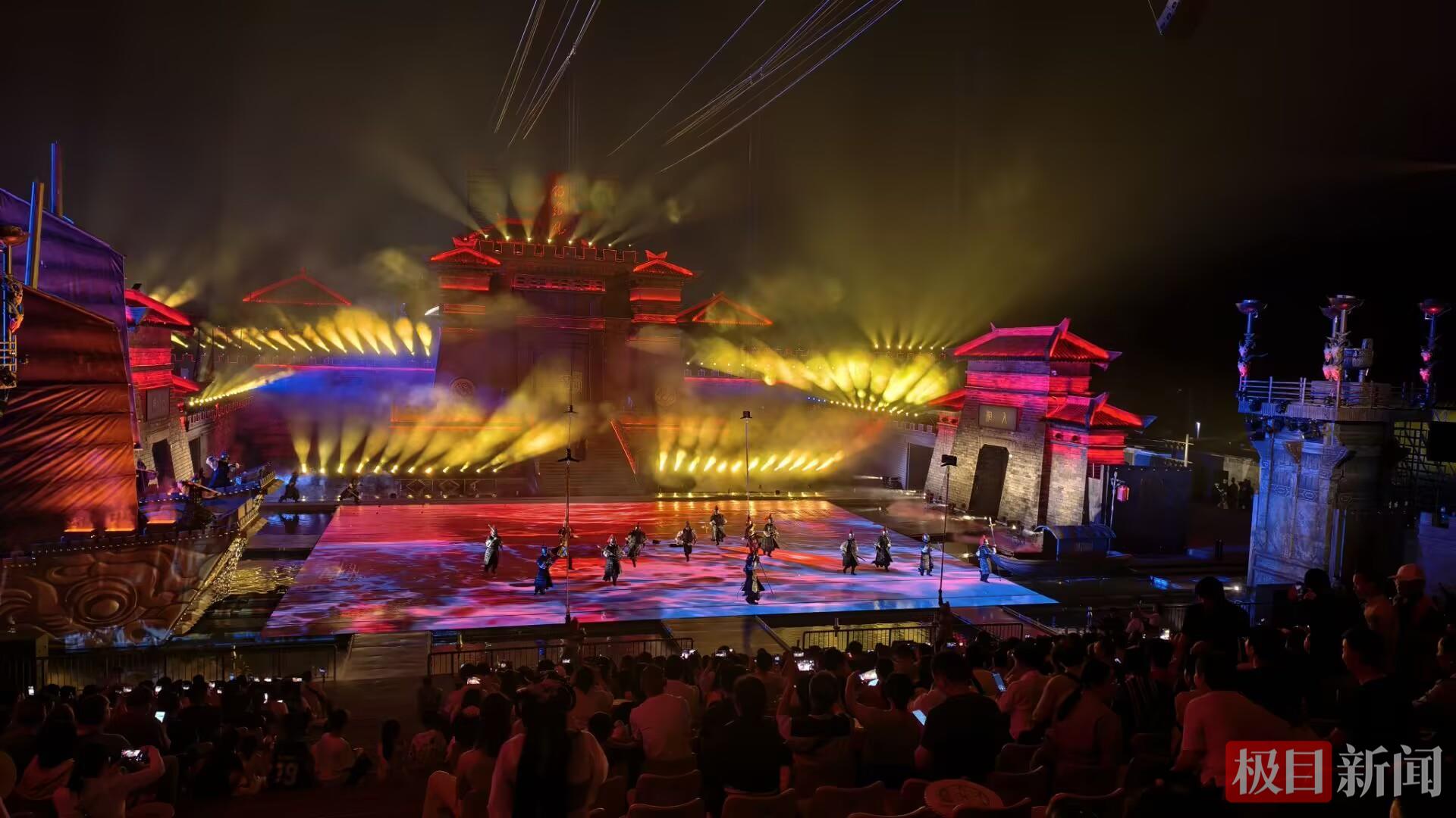 同时,特效与投影技术的巧妙运用,更是让火烧赤壁的壮丽场面逼真地呈现在观众眼前。绚丽的光影特效勾勒出风起云涌的战争场面,箭矢呼啸、战鼓震响、火光冲天,搭配光影、水雾等特效,将观众带入金戈铁马、激荡起伏的三国古战场,身临其境地感受这场决定天下三分的关键战役。