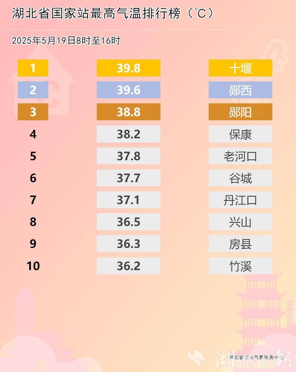 5月19日,十堰、襄阳有超过40个乡镇最高气温达40℃及以上,其他地区最高气温也升至33至36℃,随州、宜昌及恩施北部共19个县市出现35℃以上的高温天气。