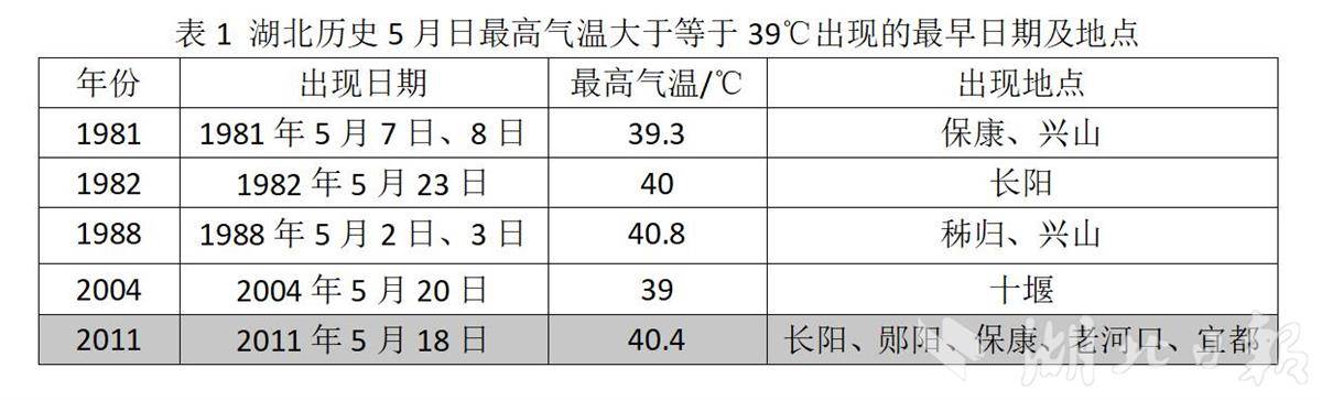 据统计,1961年至2024年,湖北省5月最高气温≥39℃的发生频率约为8%(64年中共出现5次),均出现在西部,其中3年超过40℃,最早出现在1988年5月2日、3日的秭归、兴山,达40.8℃。