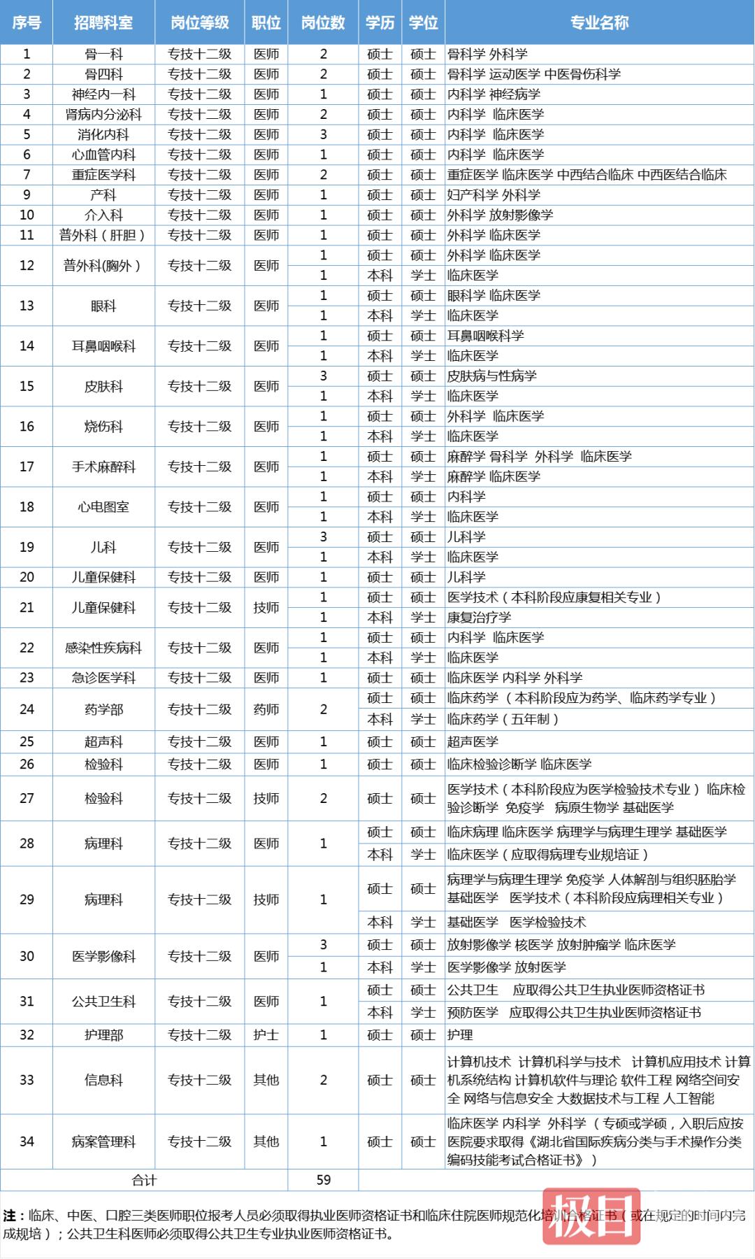 59名 (其中:医师48名、技师5名、药师2名、其他专技人员4名),具体详见《岗位需求表》。