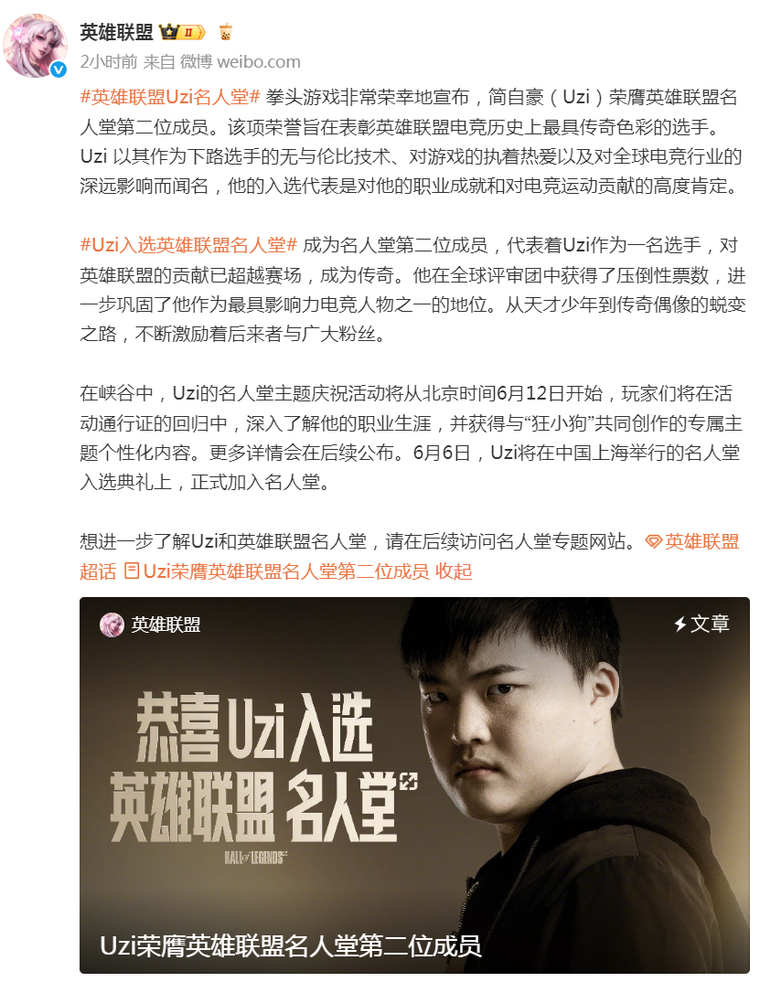 6月6日,Uzi将在中国上海举行的名人堂入选典礼上,正式加入名人堂。