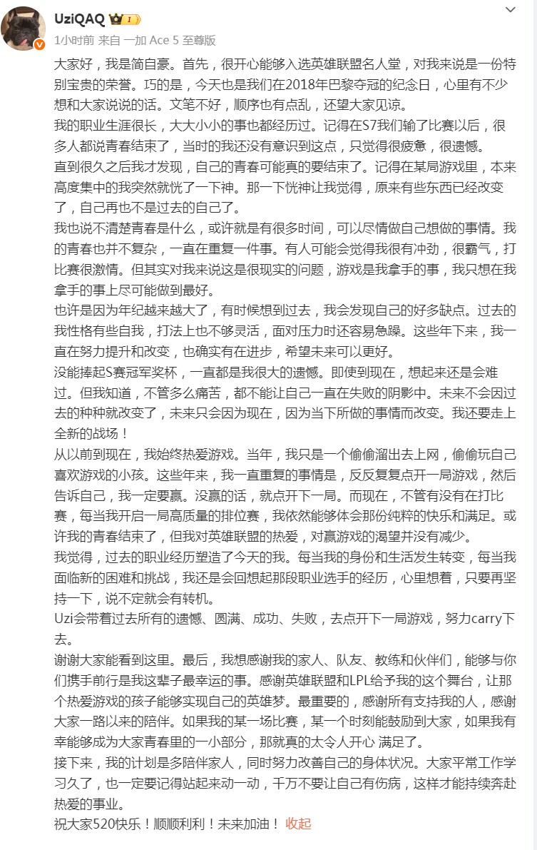 Uzi写道:“很开心能够入选英雄联盟名人堂,对我来说是一份特别宝贵的荣誉。巧的是,今天也是我们在2018年巴黎夺冠的纪念日。”