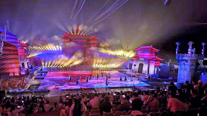 同时,特效与投影技术的巧妙运用,更是让火烧赤壁的壮丽场面逼真地呈现在观众眼前。箭矢呼啸、战鼓震响、火光冲天,搭配光影、水雾等特效,将观众带入金戈铁马、激荡起伏的三国古战场,身临其境地感受这场决定天下三分的关键战役。
