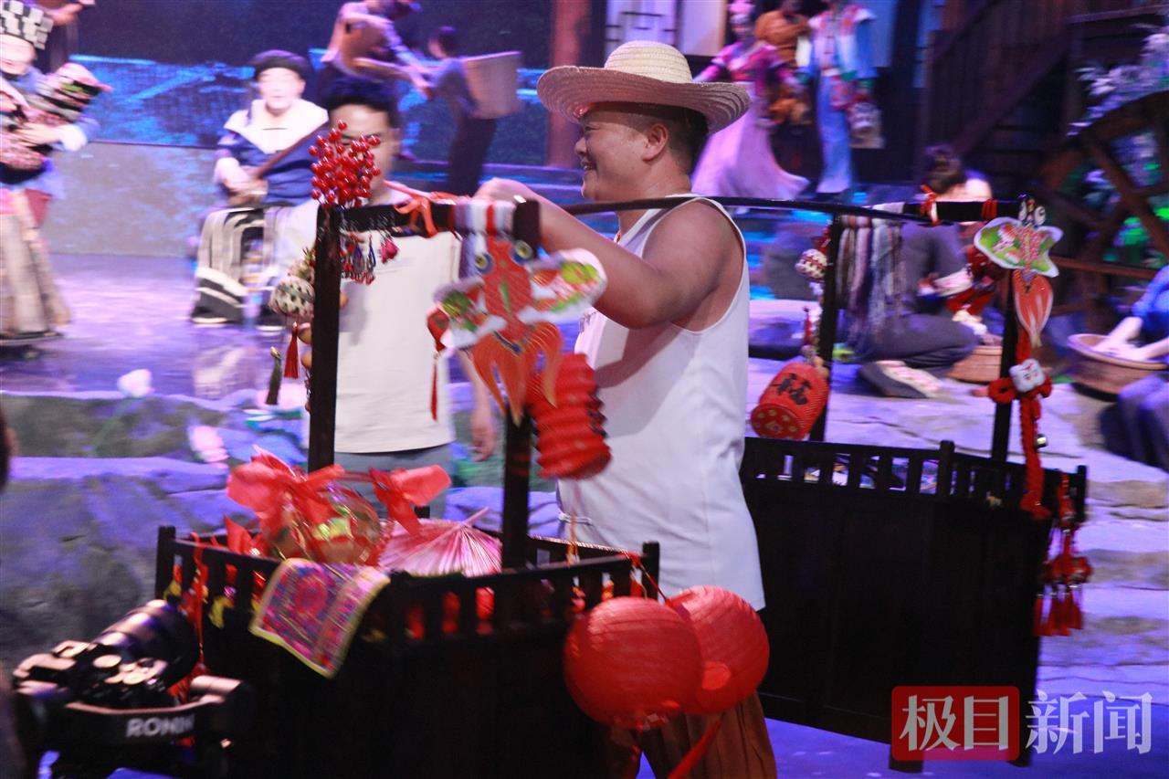 当大幕缓缓拉开,焕新后的《花咚咚的姐》瞬间以震撼的视觉效果抓住了观众的眼球。与以往不同,舞台上不再是单一的实景布景,而是通过光影技术,将清江两岸的吊脚楼群、层峦叠嶂的青山以及蜿蜒流淌的江水,立体地呈现在观众面前。随着剧情推进,光影流转间,观众仿佛置身于土家山寨的田间地头,能感受到山风轻拂,听到江水潺潺。更令人惊喜的是,观众席也成了演出的一部分。当土家担货郎带着土家特色手工艺品走进观众席,大家纷纷拿出手机拍照,过道瞬间演变为流动的非遗工坊。