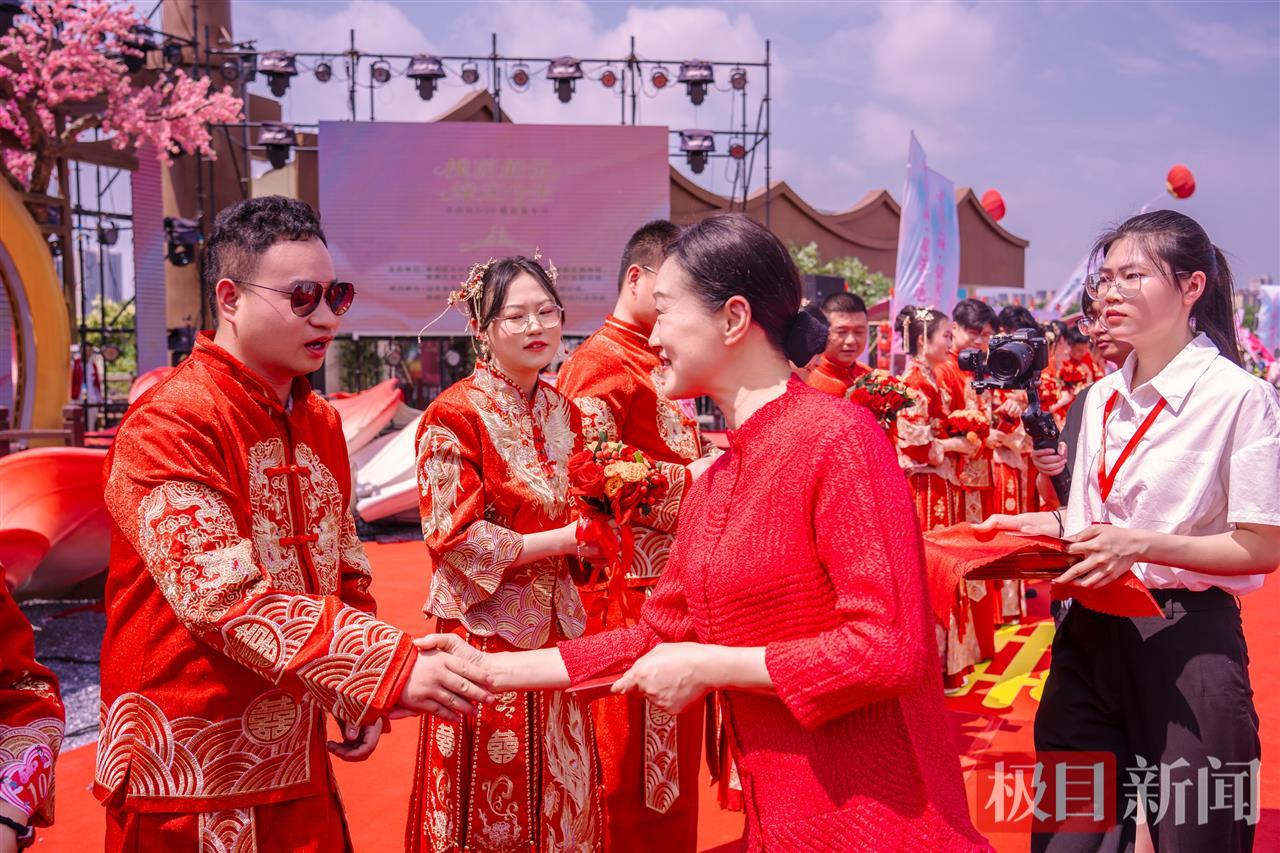 集体颁证仪式在礼乐声中拉开帷幕。新人按照传统习俗行三揖三让拜堂礼,将孝文化巧妙地融入婚俗礼仪之中。孝南区区领导姚惠萍、阚巍、张璟、侯昱峰共同组成了“良缘见证团”,为新人送上鲜花和结婚证。