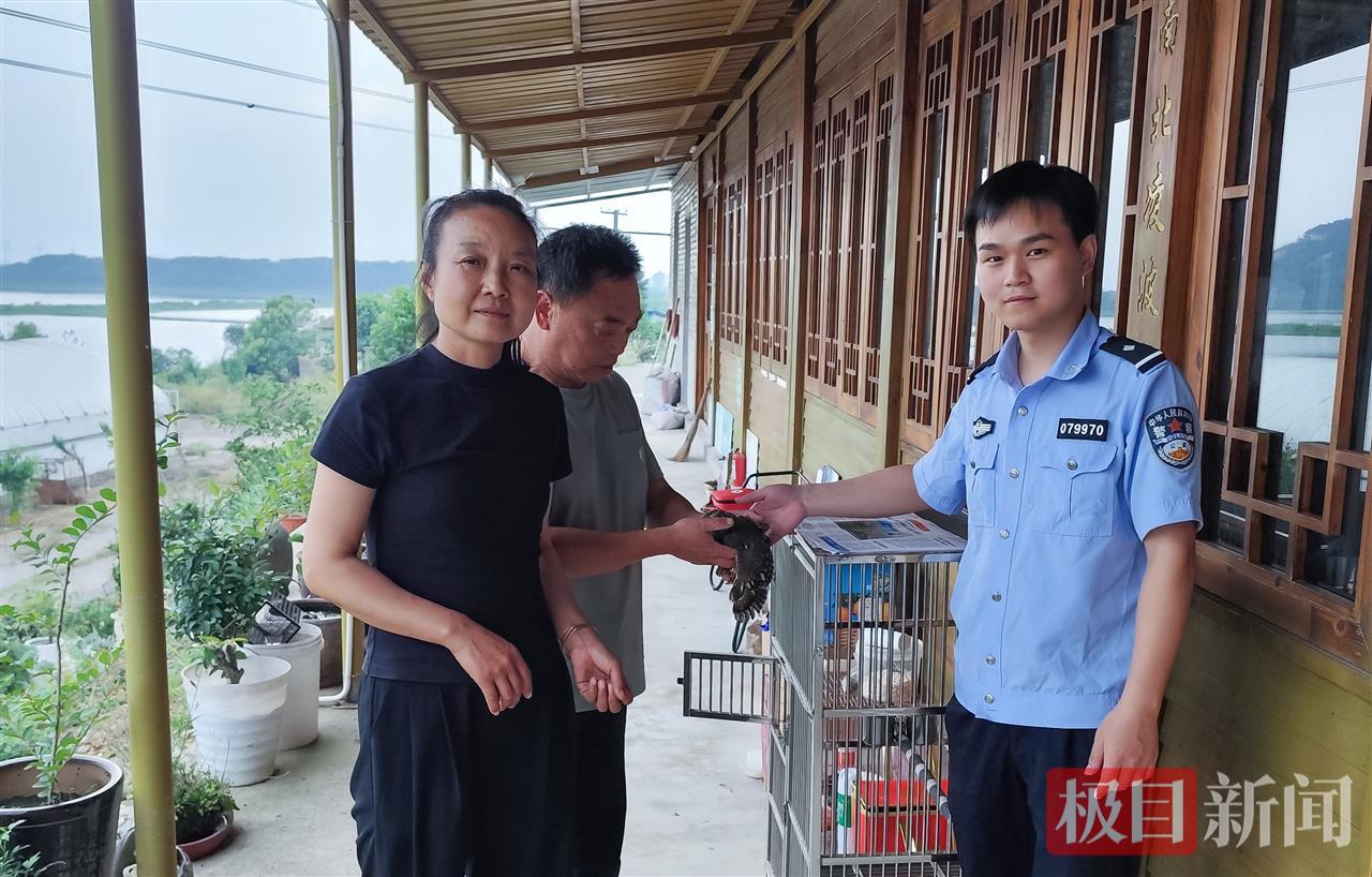 梅川派出所民警迅速赶到现场,及时将幼鸟转移至派出所临时安置,民警化身临时保育员,精心照顾幼鸟,为幼鸟喂食温水与新鲜肉食,并同时联系森林警察大队及动物保护站。确认信息后,民警当天下午驱车护送幼鸟至大法寺“一秀家庭农场”动物保护站。