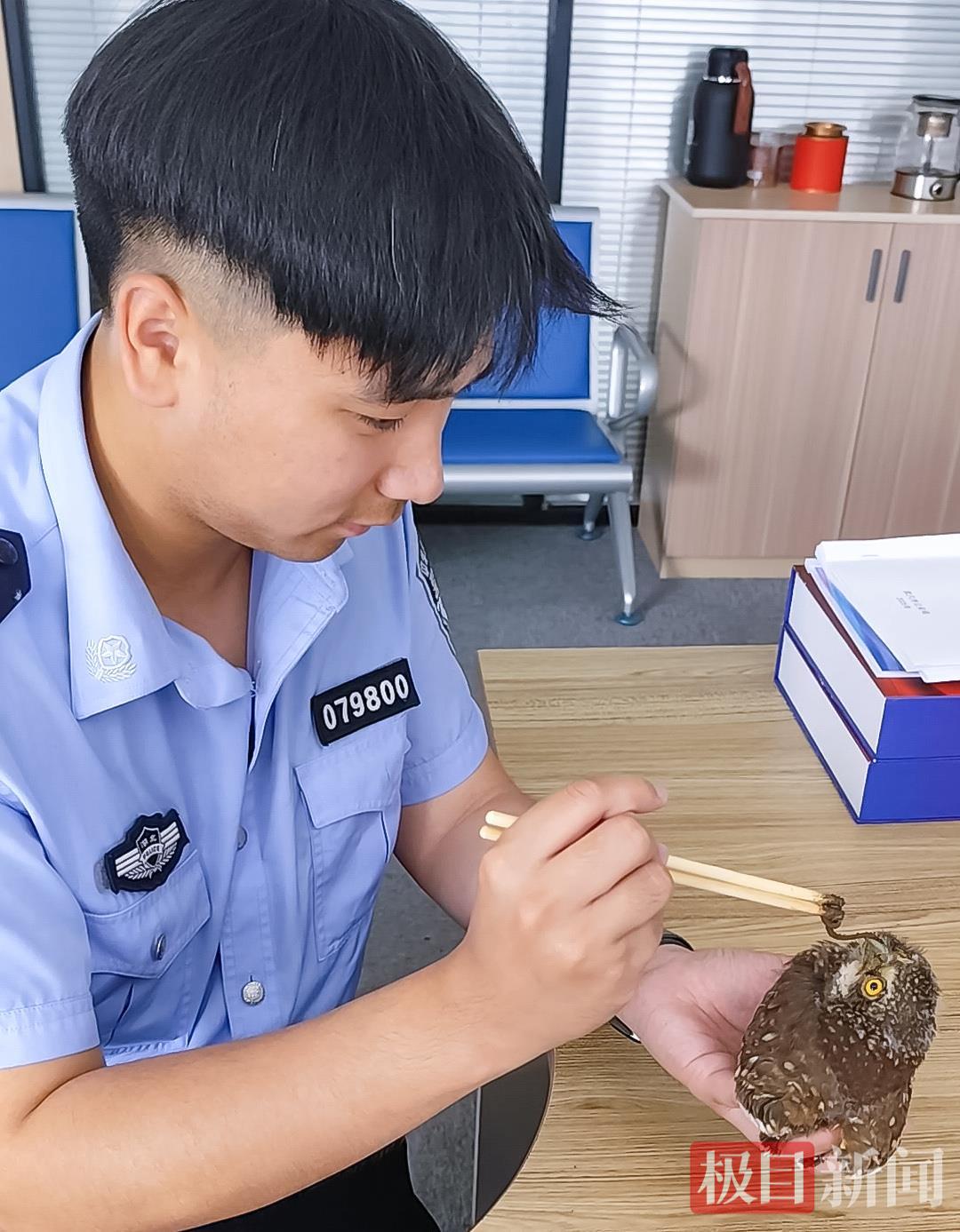 国家二级保护动物斑头鸺鹠幼鸟误入居民家中,接警民警化身临时“保育员”,随后送往动物保护站。
