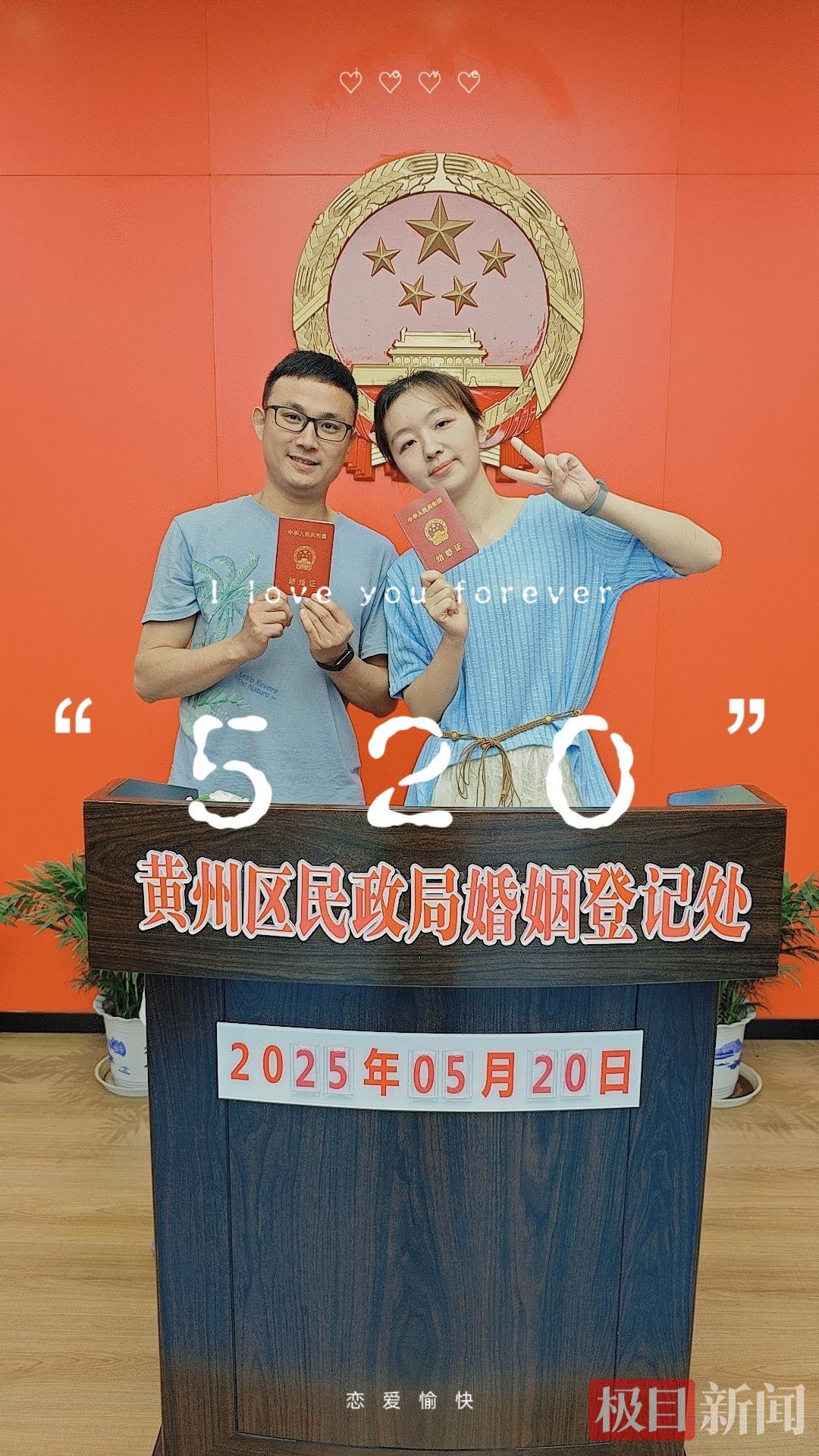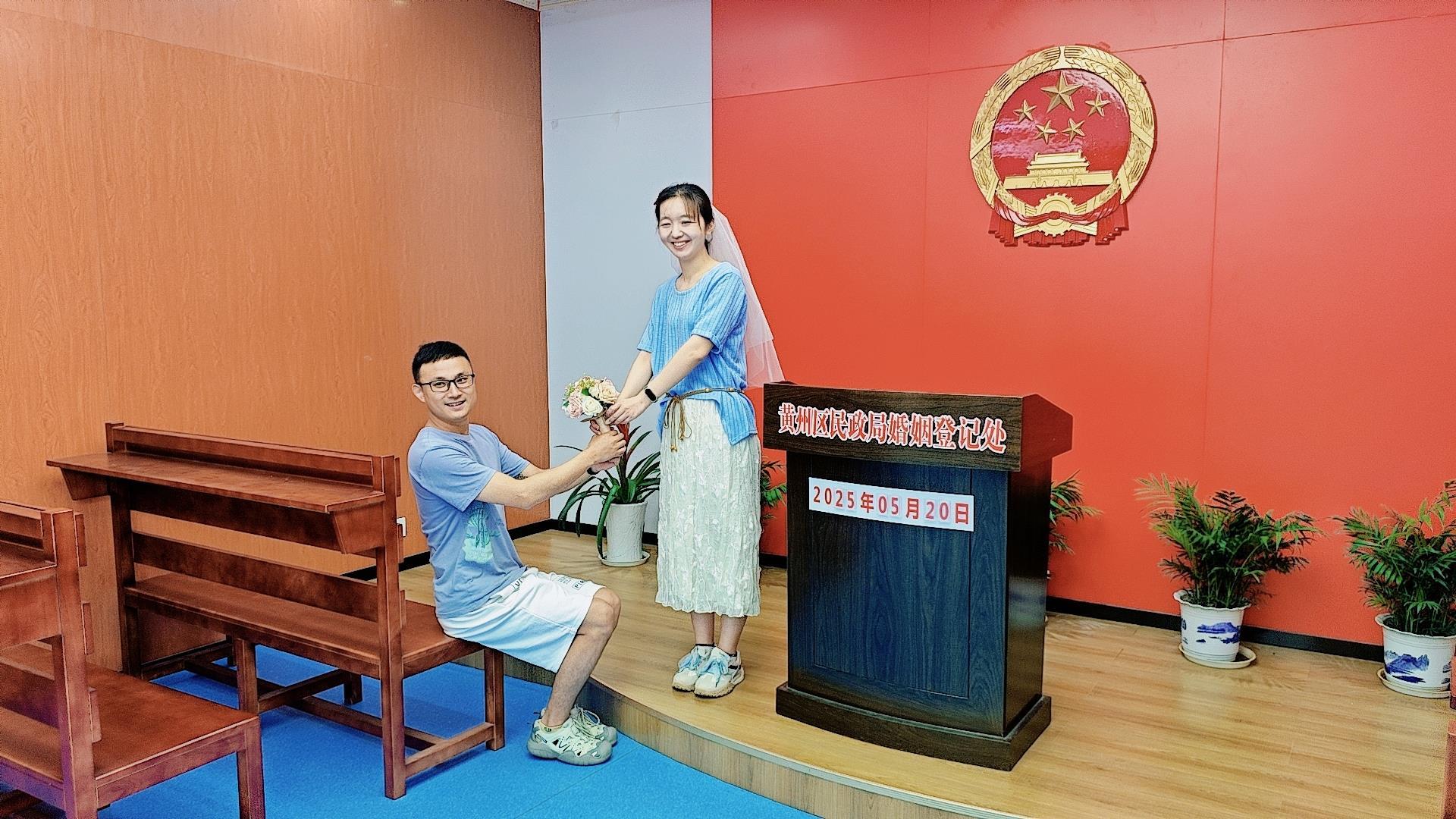 5月20日,湖北黄冈市遗爱湖畔,在江柳谣村黄州区婚姻登记处,家住黄冈的小江和鄂州的小刘经过七年的爱情长跑,终成眷属。
