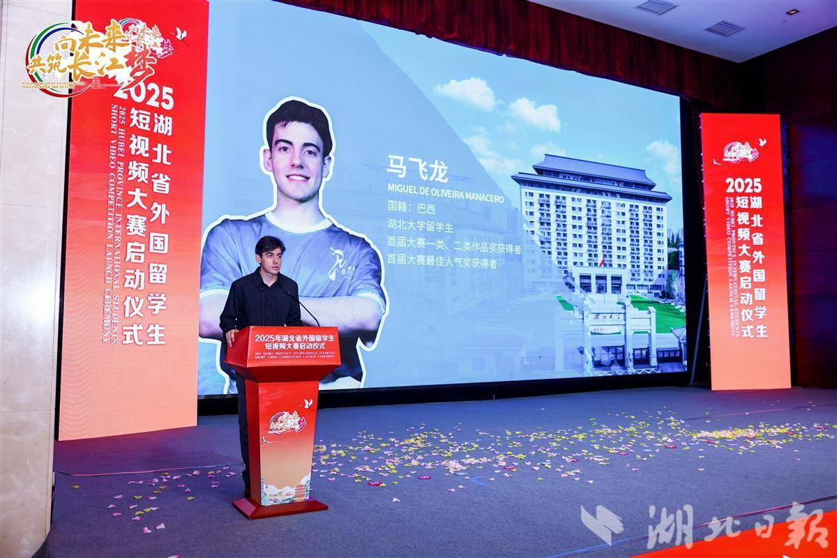 湖北日报讯(记者文俊、实习生熊静怡)5月20日上午,2025年湖北省外国留学生短视频大赛启动仪式上,湖北大学巴西籍国际学生马飞龙说:“我想和我的名字‘飞龙’一样舞出精彩人生,我想做中巴文化交流使者,让更多的大朋友小朋友认识可爱的中国,认识我最爱的中国。”