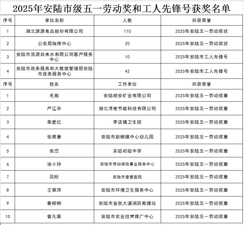 “伟大的时代呼唤伟大的精神,日前,安陆市一批集体和个人获得了荣誉表彰。其中,湖北金禄科技有限公司荣获了“湖北五一劳动奖状”,湖北五言陆色农业发展股份有限公司总经理江珊荣获了“湖北青年五四奖章”,湖北源源食品有限公司等4家企业获得了“安陆市五一劳动奖状”,安陆市金秋大道消防救援站战士秦柳柳等10人获得了“安陆五一劳动奖章”。和他们一样,在安陆,有许许多多的劳动者和青年发扬着无私奉献、爱岗敬业、不怕吃苦的劳动精神,用自己勤劳的双手创造劳动成果,为“复兴德安 振兴安陆”贡献者属于自己的力量。