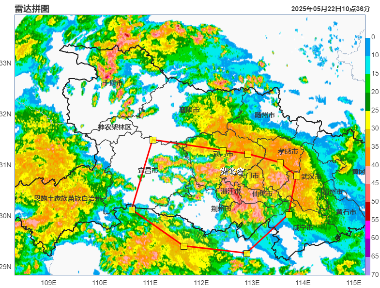 今日(22日)00时至08时,恩施、宜昌、襄阳、荆门、孝感、武汉、鄂州、黄冈等地累计雨量超过50毫米,其中武汉硚口、东西湖、汉阳、经开和钟祥、京山、鄂州城区、来凤等地超过100毫米,最大雨量为钟祥柴湖镇133.3毫米,最大小时雨强为钟祥市柴湖镇82.8毫米(22日07时),宜昌、荆州西部、随州、孝感、武汉等地还出现8到10级雷暴大风,最大为江岸区二七街道27.2米/秒(10级,22日04时)。
