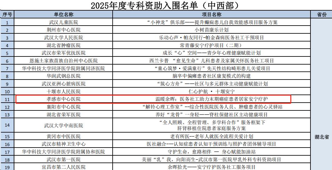 北京韩红爱心慈善基金会以严苛的筛选标准著称,其资助项目向来聚焦民生痛点,兼具社会价值与专业深度。此次孝感市中心医院从众多申报项目中脱颖而出,成功入围,意味着项目在服务模式、社会影响等方面均获得高度认可。这份国家级公益背书,不仅是对医院专业能力的肯定,更赋予项目更强的社会公信力与资源整合力,为末期癌症患者的安宁疗护之路保驾护航。
