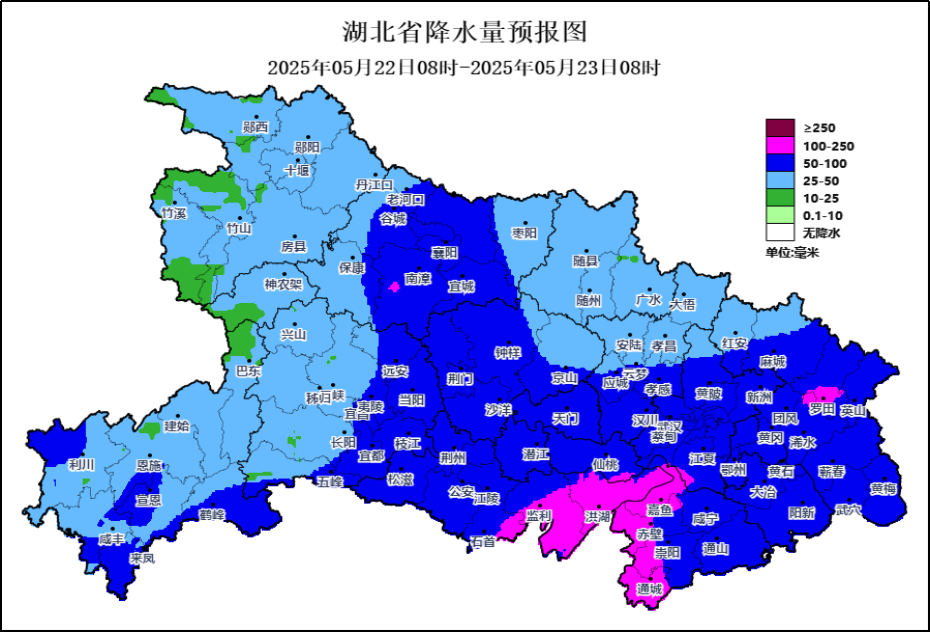 5月22日08时-23日08时,鄂西北东部、江汉平原、鄂东南、鄂东北东部阴天有大雨到暴雨,局地大暴雨,单点特大暴雨;其他地区阴天有中到大雨,局地暴雨。省内部分地区伴有短时强降水,雷暴大风等强对流天气。最高气温中西部23~27℃、东部27~30℃,最低气温17~22℃,偏南风3到4级转偏北风3到5级、阵风6到9级。