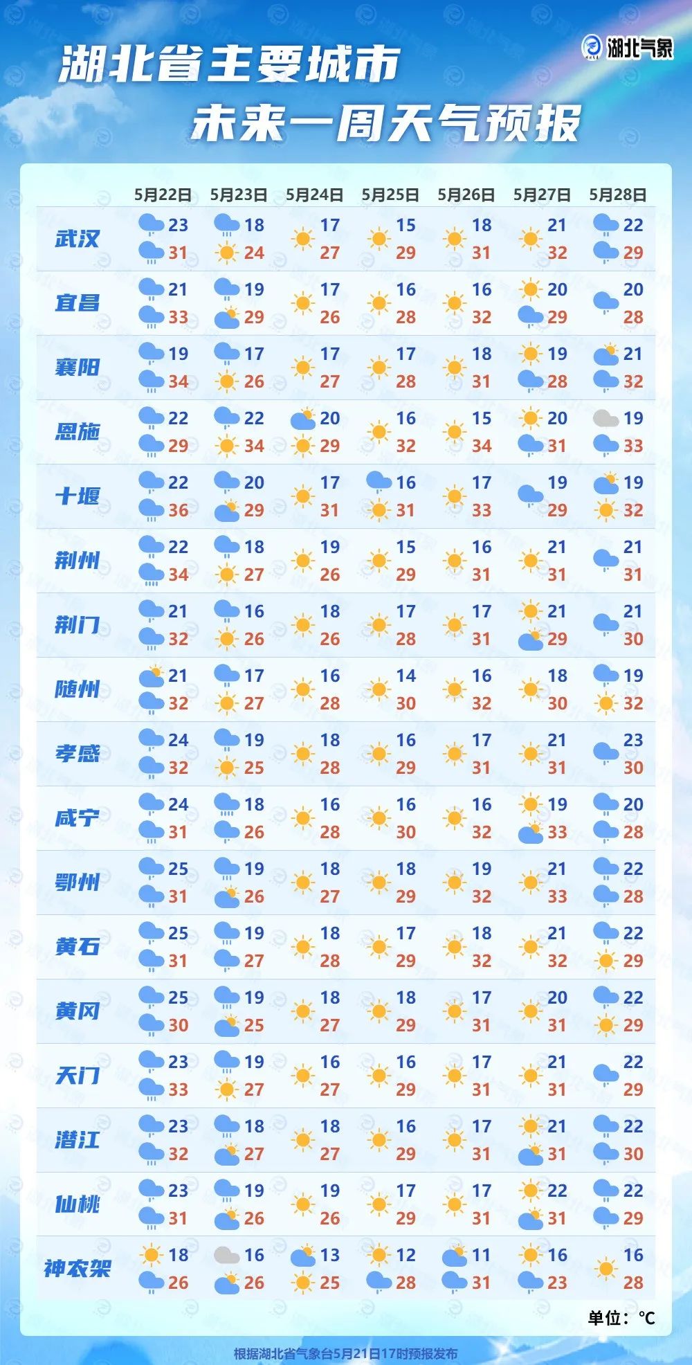 5月24日08时-25日08时,全省多云到晴天,夜间鄂西北局地有阵雨或雷阵雨。最高气温十堰29~31℃、其他地区25~29℃,最低气温14~18℃,偏北风2到3级。