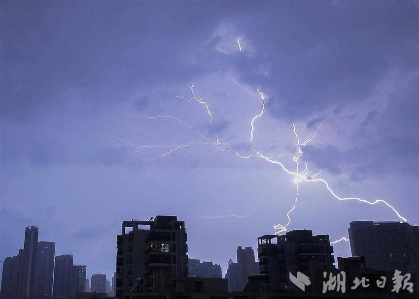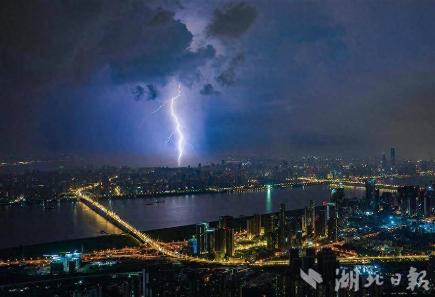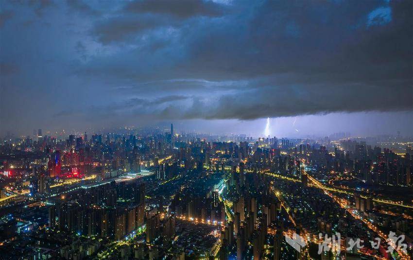 5月22日凌晨,武汉出现强对流天气过程,从高空俯瞰武汉城区,乌云压境,雷雨大风交加,一道道闪电划破天际。(湖北日报全媒记者 柯皓 摄)