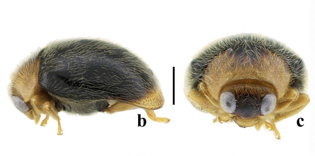 采自神农架林区板桥河村、坪阡古镇。新种体卵圆形,背面中度拱起,体表密布细毛。头壳黄色但两眼间有一大黑斑,触角及口器黄棕色,眼间距明显宽于眼宽。