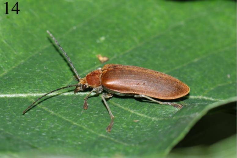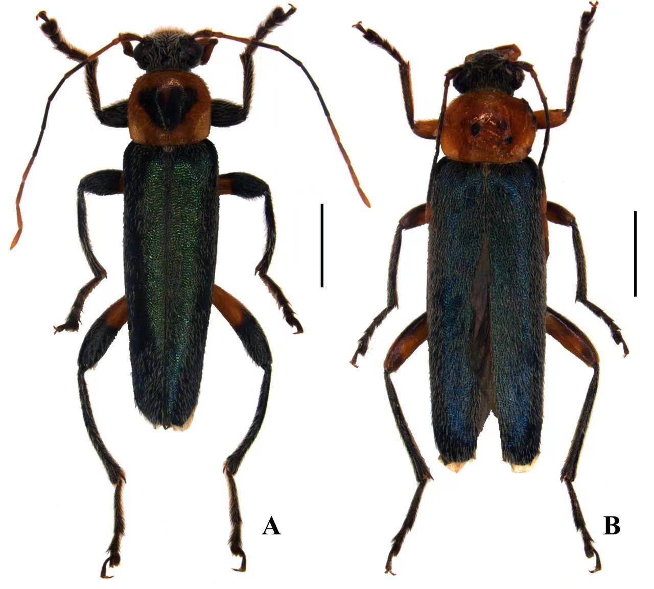 简介:于神农架东溪保护站发现,雄虫头部、触角、前胸背板、小盾片和腹面黑色,鞘翅和足深褐色,雌虫外形特征与雄虫极为相似但头部、触角、前胸背板、小盾片和腹面为深褐色。