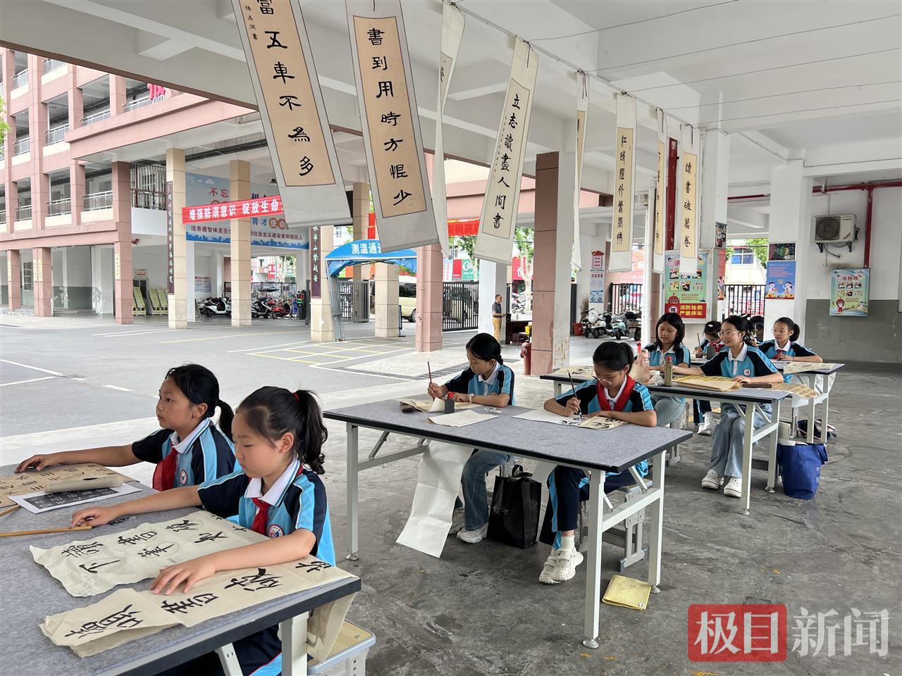 上午九点,一行人踏入广水市第一实验小学。十多副装裱精美的楹联书法作品,错落有致地悬挂于教室连廊的架空层之上,尽显书法艺术的万千气象。步入校园,随处可见楹联作品,尤其是教学楼正大门的“风声雨声读书声声声入耳,家事国事天下事事事关心”的对联,时刻激励学生在专注学业的同时,心怀家国,树立兼济天下的志向。