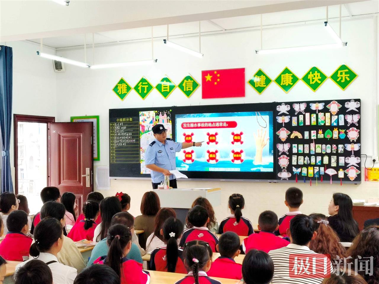 “同学们,在没有家长陪同的情况下,千万不能下河玩水、游泳。”安全课上,小学生看完防溺水警示动画片后,民警结合孩子们的年龄和心理特点,以生动形象、通俗易懂的语言和互动问答、现场演示等方式,对小学生进行警示教育,并向孩子们传授了如何防溺水,以及自救措施等安全防范常识。课堂上,同学们积极参与、踊跃发言,现场气氛活跃,在答题的同时也把相关安全知识牢记心中。