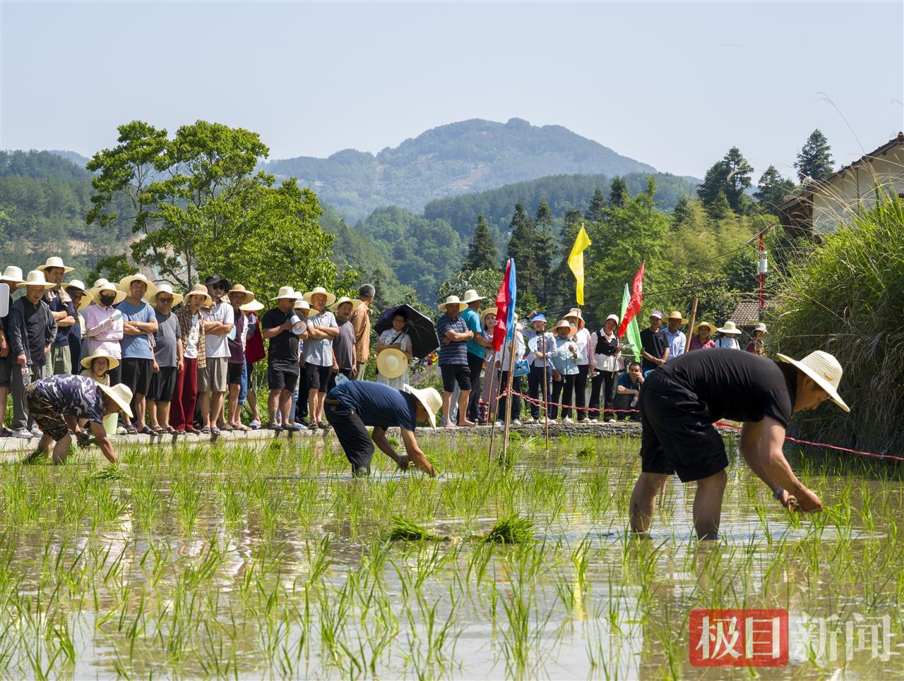 团体赛更具看点,10支队伍在5分钟内“会战”,分别在8平方米的水田里进行插秧,田埂上加油声与田间劳作声交织。抓泥鳅、插秧体验区同样热闹,游客们卷起裤腿跳进泥田,泥浆与水花齐飞,笑声共欢呼回荡,重拾儿时乐趣。