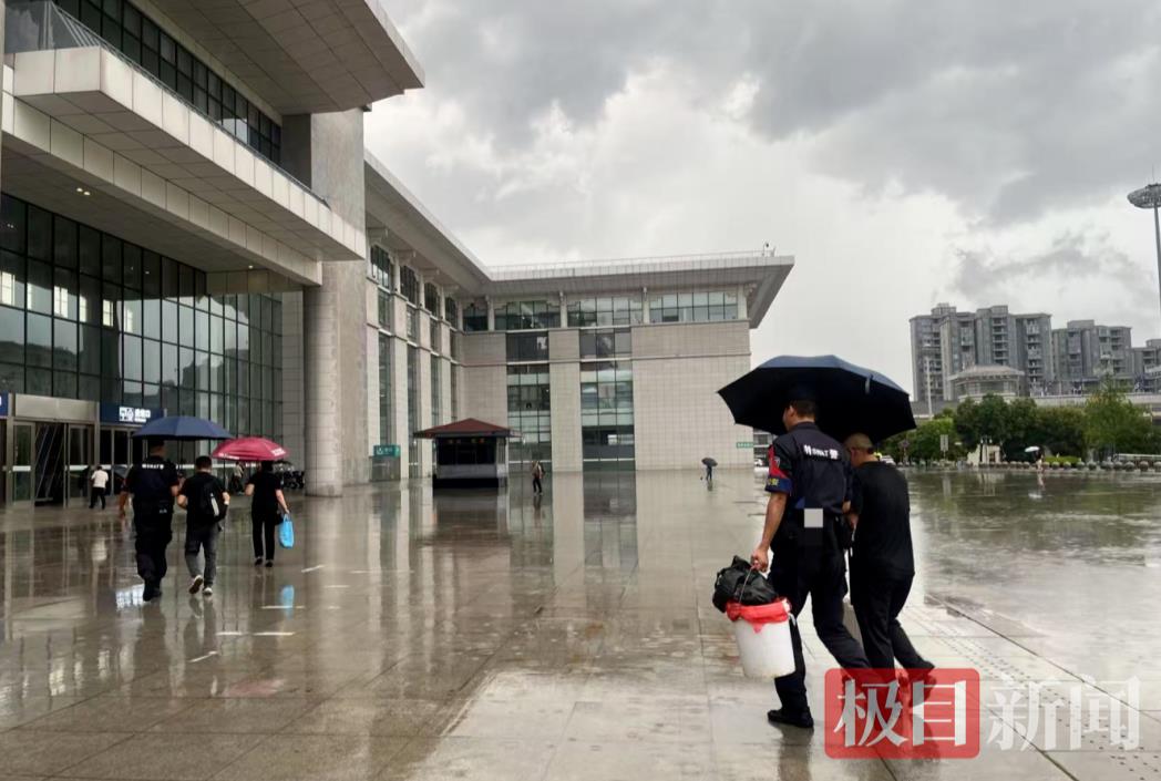 “叔叔,雨大路滑,我送您进站!”13时许,在鄂州火车站进出口,特警队员手持雨伞,来回穿梭于人群之中,看到没带伞的旅客主动上前护送,尤其对老人、孕妇、携带幼儿的旅客等人群,更是全程帮扶。