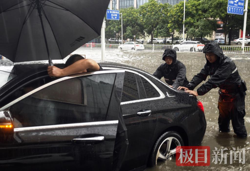 在武汉东路段,一辆小轿车因积水过深熄火,积水已经没过车轮,车内人员被困在积水中,焦急万分。巡逻特警挽起裤腿,踏入湍急的积水中,用双手紧紧抓住车辆,经过近半小时的努力,特警队员协助车主将被困车辆成功推至路边安全地带。