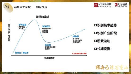 至于如何投资布局,他提示应遵循盖特纳曲线的发展思路,警惕技术泡沫但需抓住产业化拐点,以长期视角交易布局。在盖特纳曲线中,当一个新的技术、题材出现时,市场最初反应是最激烈的,也充斥着大量泡沫,只有当泡沫破灭,行业才会迎来一个稳定成熟的产业化发展趋势,因此投资者要学会忍受波动,以一个长期的视角去投资科技。