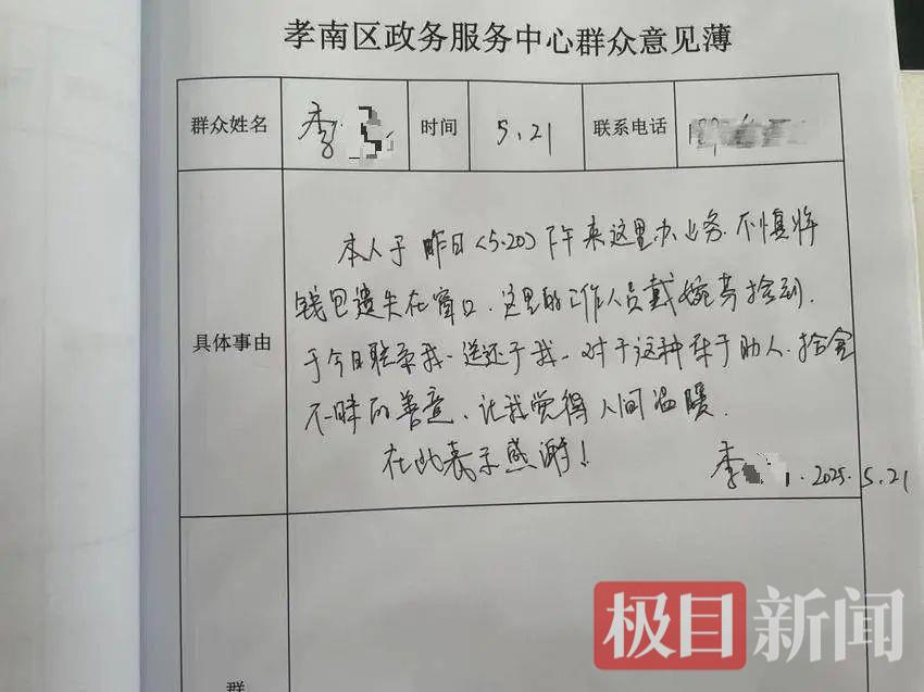 失而复得的喜悦让李先生感慨万千,他在信中不仅对“孝着办”帮办人员拾金不昧的个人品德表达诚挚感谢,更对“孝着办”服务团队专业素养和孝南区政务服务中心热情为民、认真负责的优质服务给予高度赞扬。