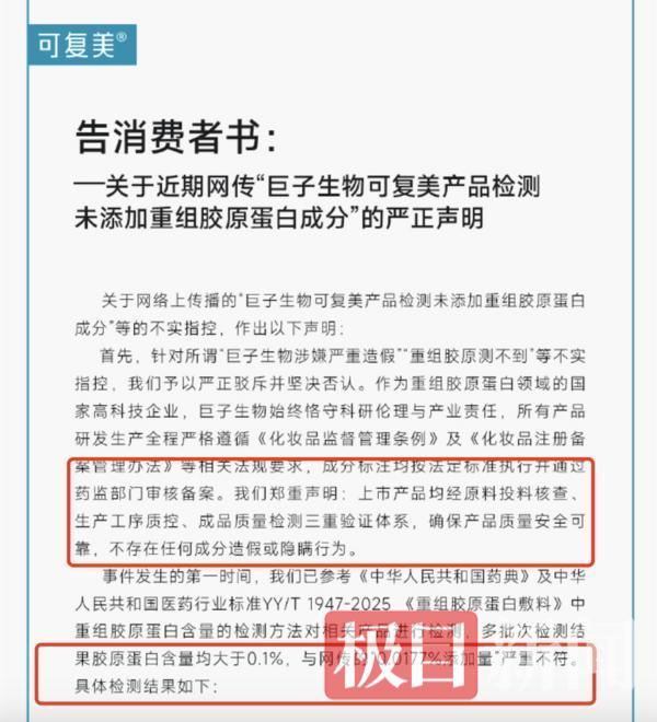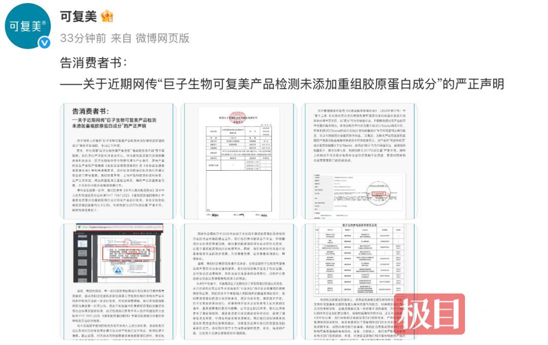 5月24日晚,巨子生物旗下品牌可复美在官方微博发布“告消费者书”,回应“巨子生物可复美产品检测未添加重组胶原蛋白成分”等问题。