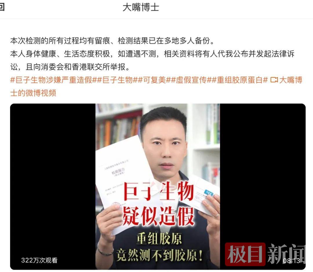 5月24日,美妆博主“大嘴博士”发文《巨子生物疑似造假?!重组胶原竟然测不到胶原!》。