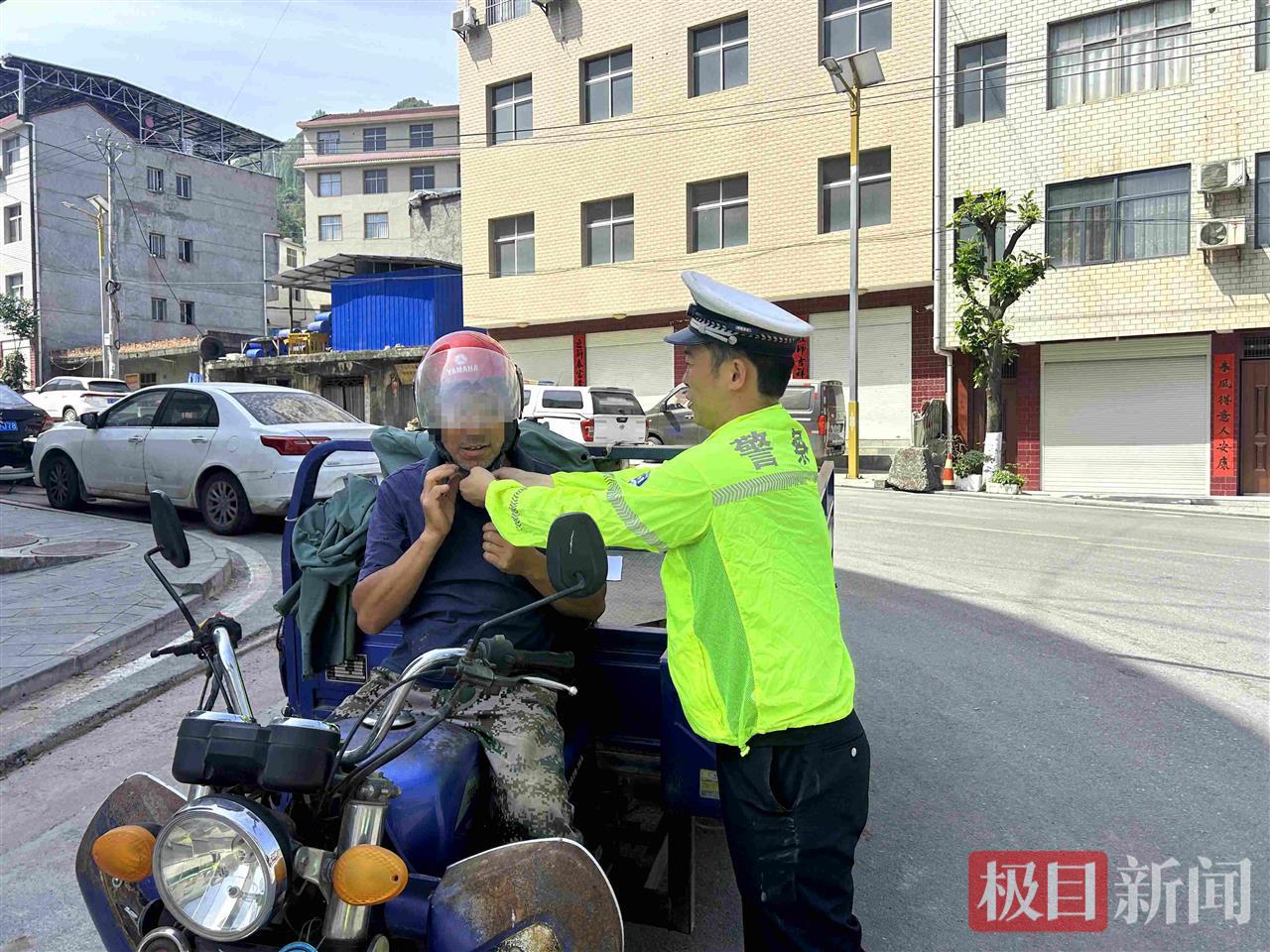 “头盔不是随便戴在头上就行,要调节好束带、扣紧下颌处的卡扣,关键时刻才能起到防护作用!”5月26日,在湖北省襄阳市保康县马桥镇马桥街,执勤交警一边拦停纠正骑乘摩托车未佩戴安全头盔的驾驶员,一边向他们现场讲解正确佩戴安全头盔的要领。