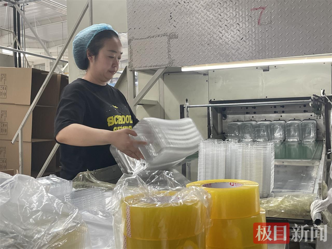 湖北凯普奥塑料有限公司工人正在智能化生产线上打包包装盒