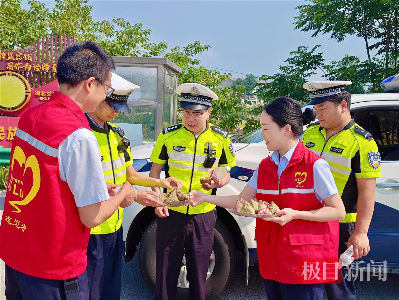 志愿者们邀请执勤高警一同品尝粽子