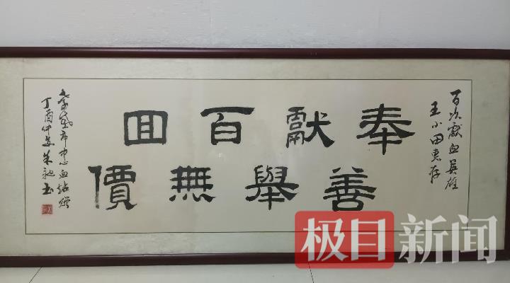 王小田参加无偿献血100次后,当地书法家赠送给他的礼物