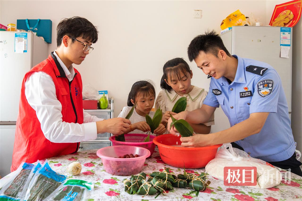 温馨的视频连线结束后,一场欢乐的包粽子互动拉开帷幕。志愿者们提前备好了糯米、红枣、粽叶等材料,张雪洋一边教孩子们捋粽叶、填糯米,一边将小女儿放在腿上耐心指导:“先把粽叶折成小碗的样子,再把糯米放进去,红枣要藏在中间哦!”喜月学得十分认真,小心翼翼地包裹粽叶,却总在绑绳子时散开,急得直皱眉。张雪洋的小女儿挥舞着小手,咿咿呀呀地为姐姐加油,逗得众人忍俊不禁。萱萱则在一旁“现学现卖”,有模有样地教志愿者阿姨调整粽叶角度,现场充满欢声笑语。