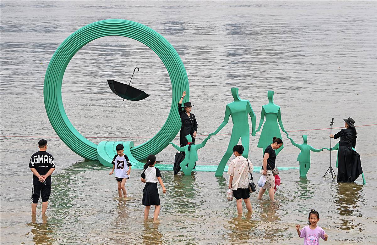 2024年6月27日下午,武汉汉口江滩旁的“一家五口”雕像处,一些市民游人在安全区内嬉水纳凉。(湖北日报全媒记者 朱熙勇 摄)