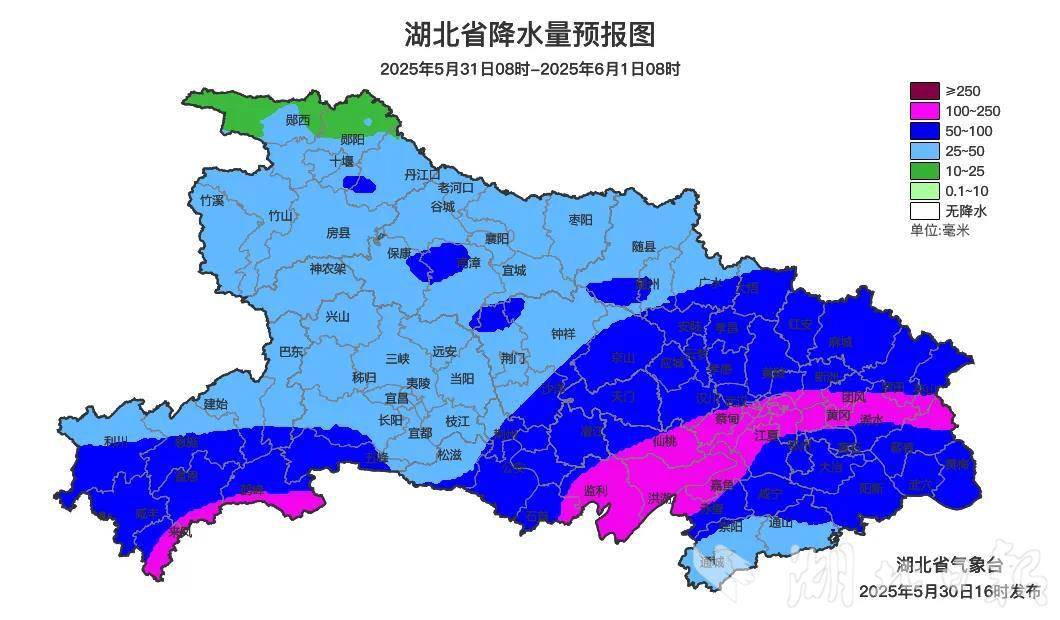 气象专家介绍,5月31日至6月1日,是本轮降雨过程的核心影响时段。5月31日鄂西南南部、江汉平原东部及东部地区有大雨到暴雨,局地大暴雨,其他地区阴天有中到大雨,局地暴雨,省内局地伴有短时强降水、雷暴大风和雨雾。6月1日,全省雨势有所减小,东部地区有中到大雨,局地暴雨,并伴有雷电,其他地区阴天有小到中雨,局地大雨。2日雨水停歇,全省多云,仅鄂东南南部和鄂西南局地有阵雨。此外,还有北风强劲。6月1日最高气温大部为20至25℃,2日有2℃左右回升。