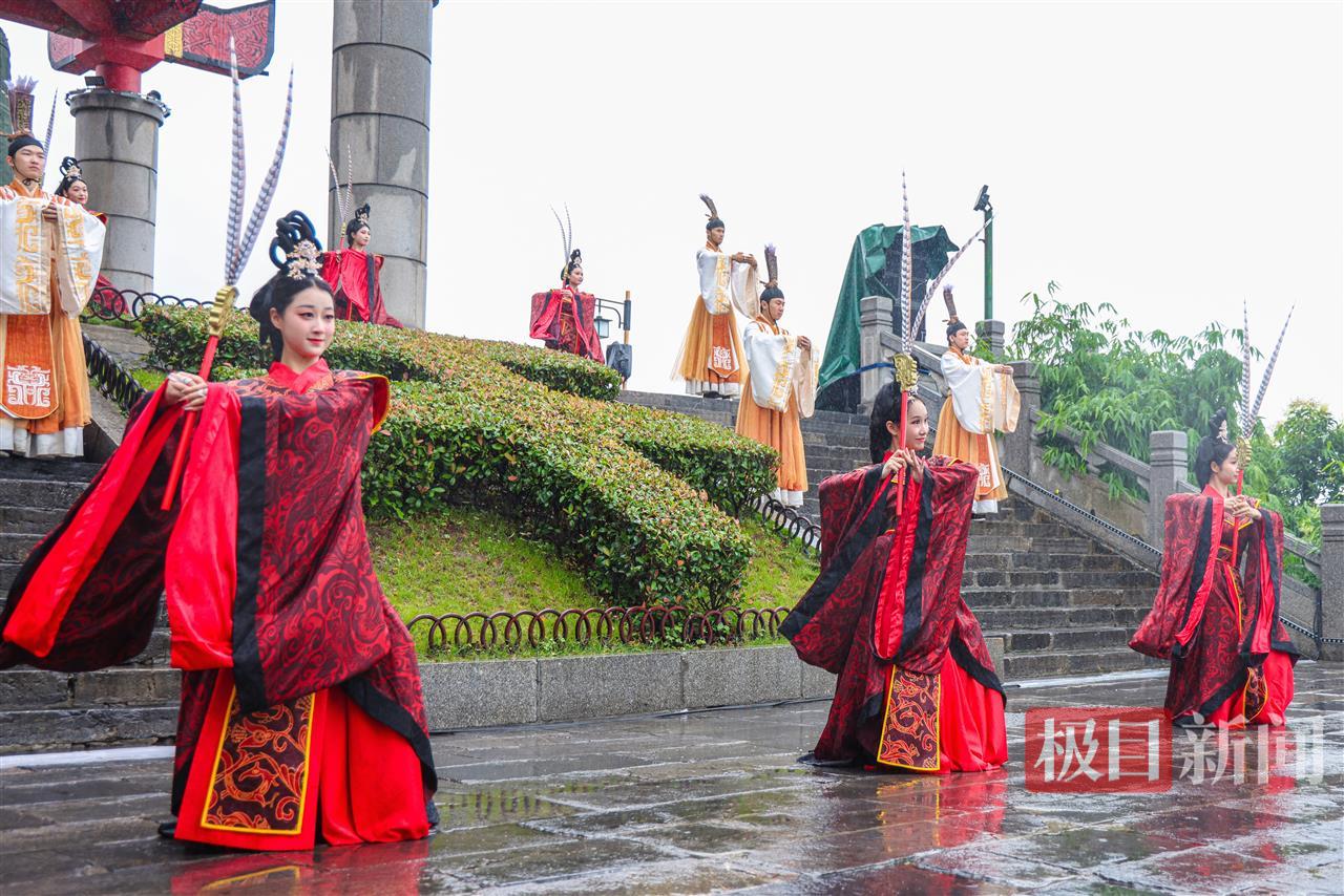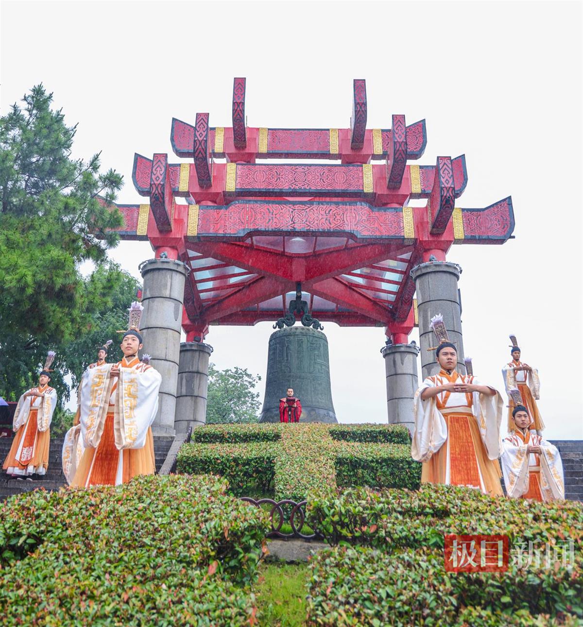 《鸣钟祈福礼》以“遵礼、兴乐、重文”为核心理念打造,既遵循古代仪制庄重,又融入当代文化表达。整场祈福仪式分为迎宾、吟诵、行礼、楚舞表演、鸣钟等仪程。