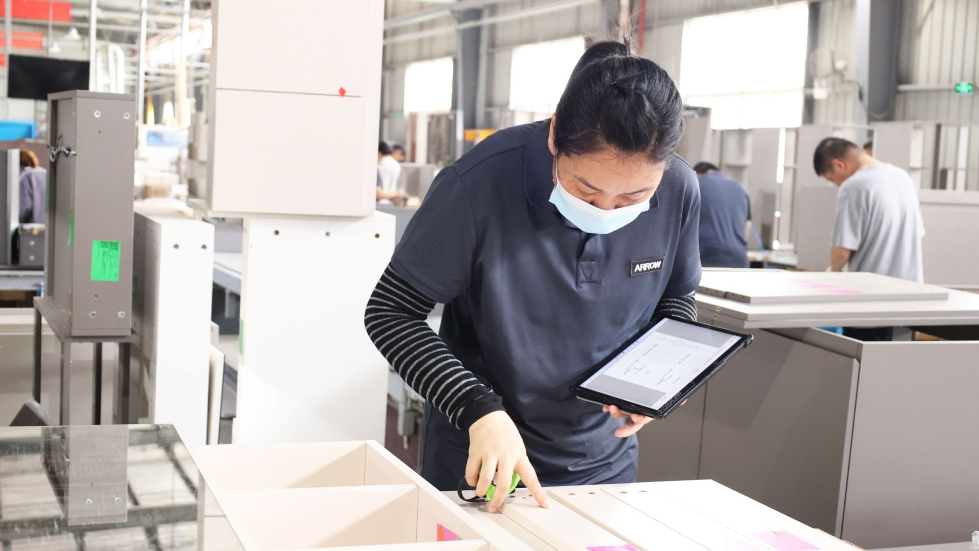 据了解,今年乐华厨卫投入1300万元推动智能化改造,积极引进自动化封边机械手代替人工劳作,让每台数控设备均与服务器相连,可实时接收订单数据。同时,通过英格系统的应用,实现了前端设计效果图与工厂设备控制的无缝对接。消费者下单后,订单信息即时传输至系统,经过审单、下单等流程,迅速转化为生产指令,进一步提升了生产效率和产能。