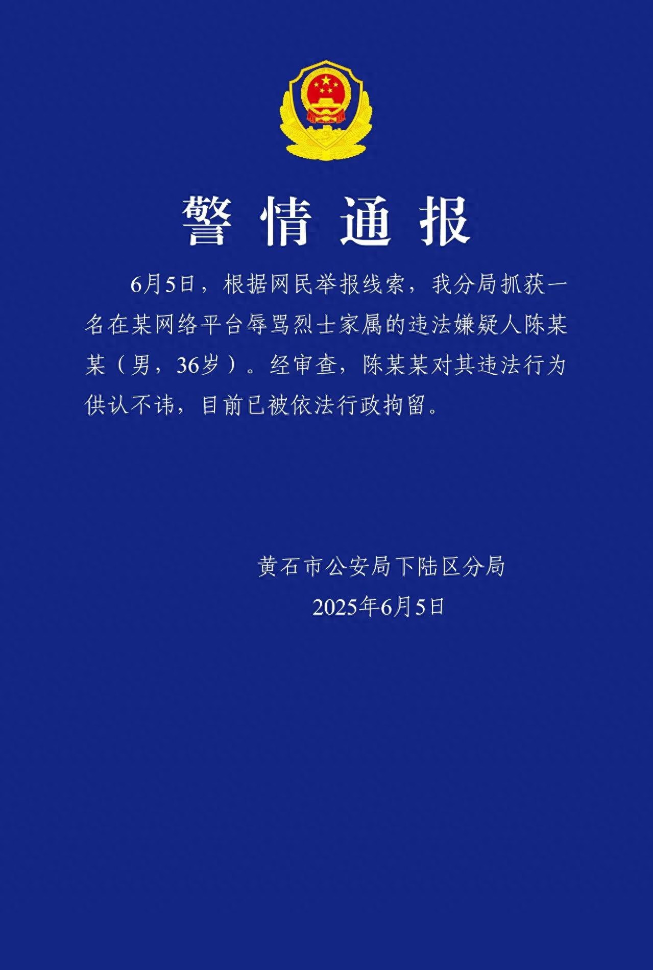 6月5日,湖北黄石警方发布通报,根据网民举报线索,黄石市公安局下陆区分局抓获一名在某网络平台辱骂烈士家属的违法嫌疑人陈某某(男,36岁)。经审查,陈某某对其违法行为供认不讳,目前已被依法行政拘留。