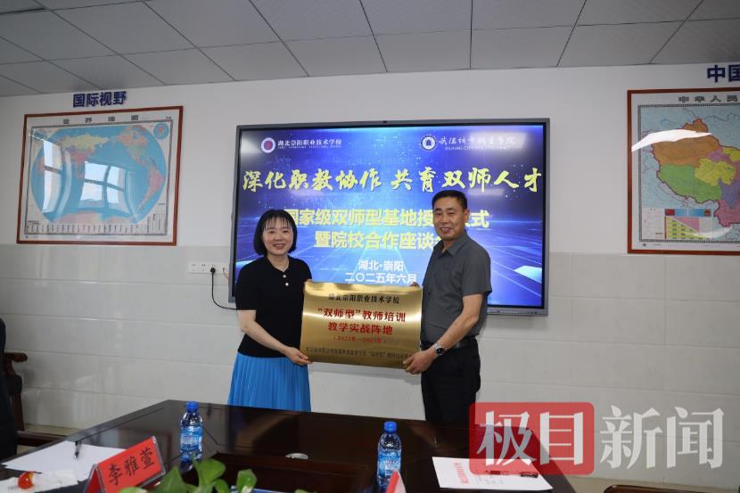 随后,禹诚院长代表武汉城市职业学院向崇阳职业技术学校授予“‘双师型’教师培训教学实战阵地”牌匾,标志着双方在“双师型”教师培养方面的合作正式启动。