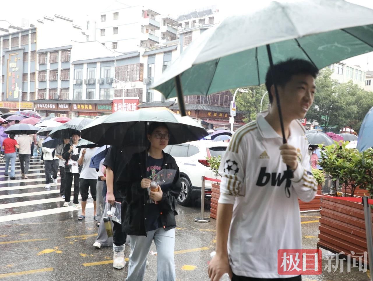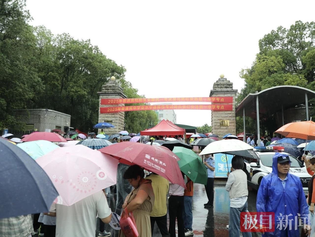 7日一大早,雨幕中,红安一中考点外早已人头攒动。家长们撑着伞,护着孩子手中的准考证和文具,目送他们走进考点大门。
