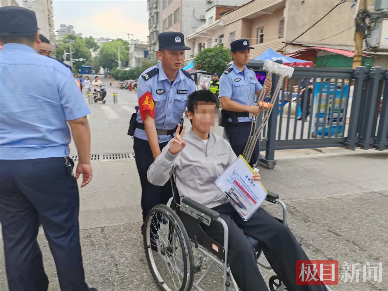 在大冶六中考点,一名脚部骨折的学生小鲁在家长的陪伴下艰难抵达。行动不便的他,坐在轮椅上,进入考场成了难题。大冶市公安局金湖所民辅警迅速行动,他们接过轮椅,小心翼翼地推着小鲁,一路护送,确保他能顺利进入考场,安心参加这场人生大考。